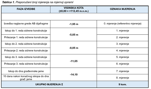 Generalno, učestalost mjerenja na mjernoj opremi može biti sljedeća (primjer je dan za privremenu građevinsku jamu):